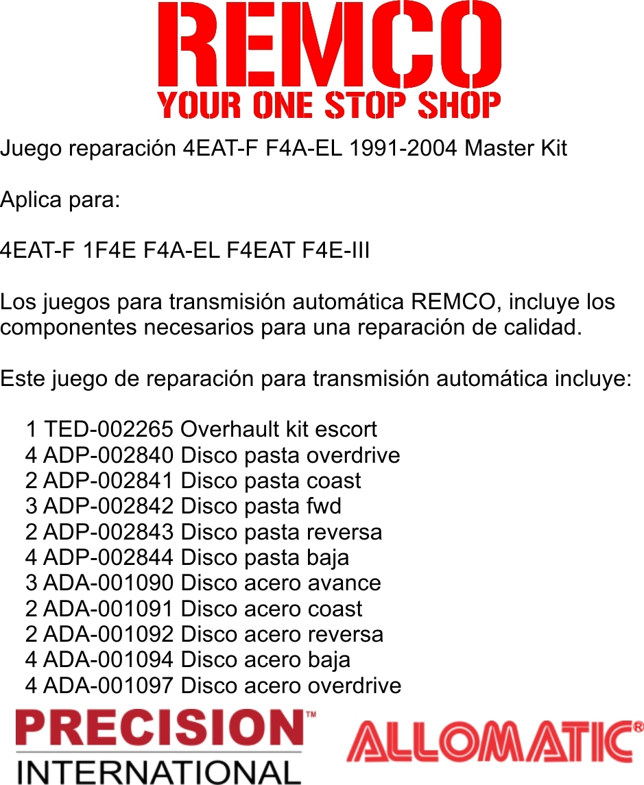Los juegos para transmision automatica REMCO, incluye los componentes necesarios para una reparacion de calidad.