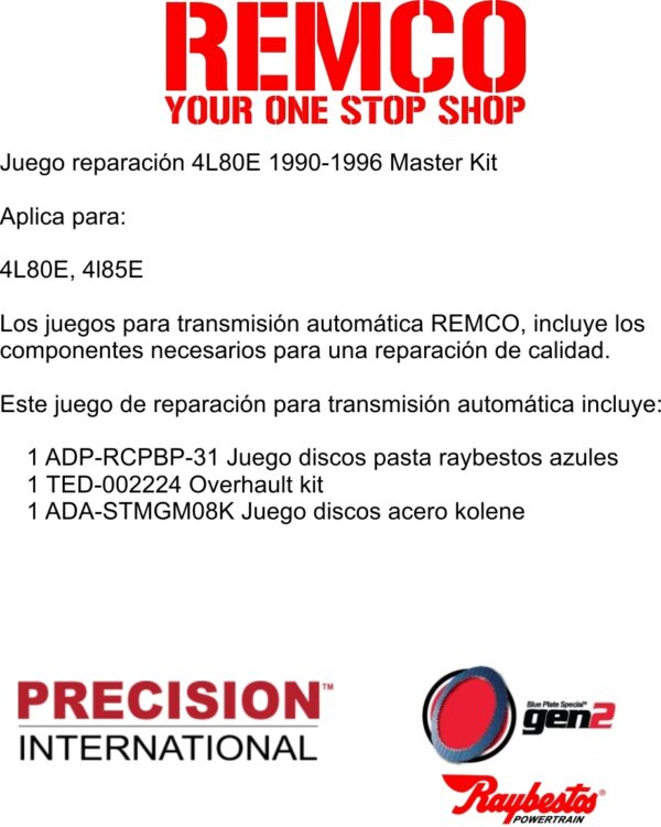 Los juegos para transmision automatica REMCO, incluye los componentes necesarios para una reparacion de calidad.