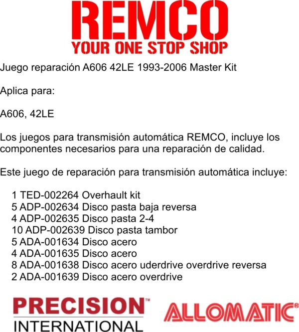 Los juegos para transmision automatica REMCO, incluye los componentes necesarios para una reparacion de calidad.