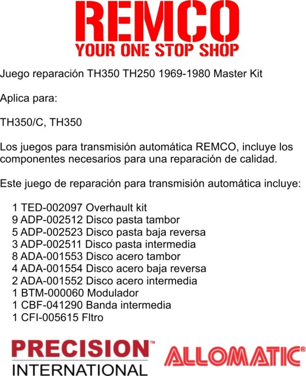 Los juegos para transmision automatica REMCO, incluye los componentes necesarios para una reparacion de calidad.