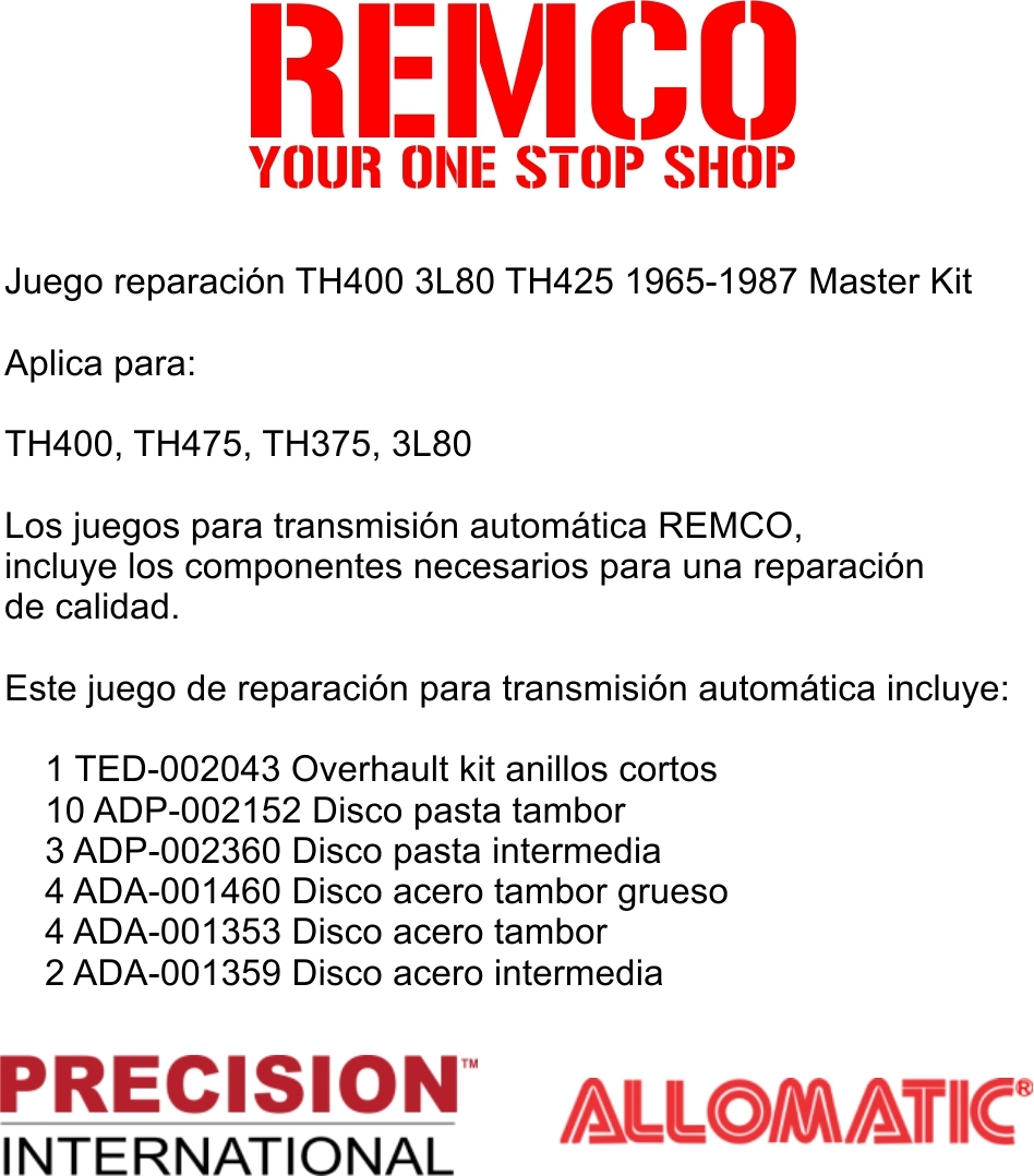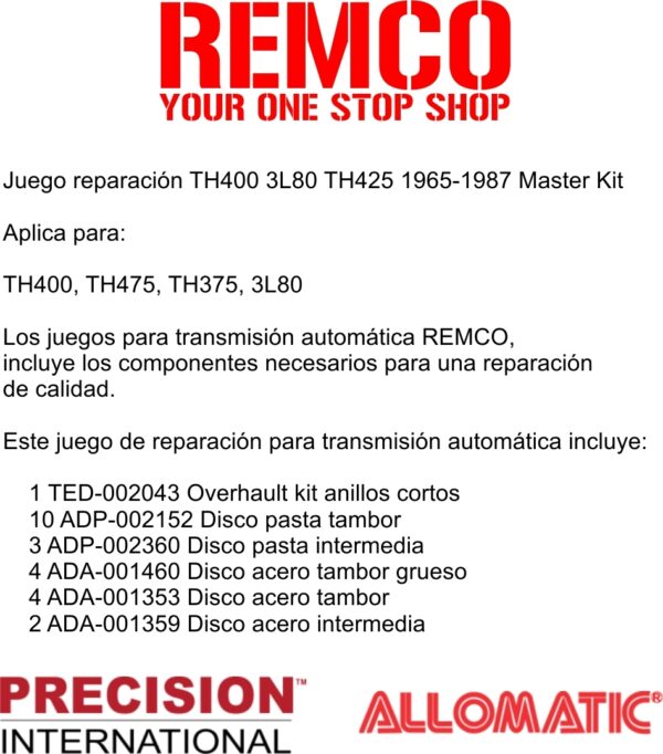 Los juegos para transmision automatica REMCO, incluye los componentes necesarios para una reparacion de calidad.