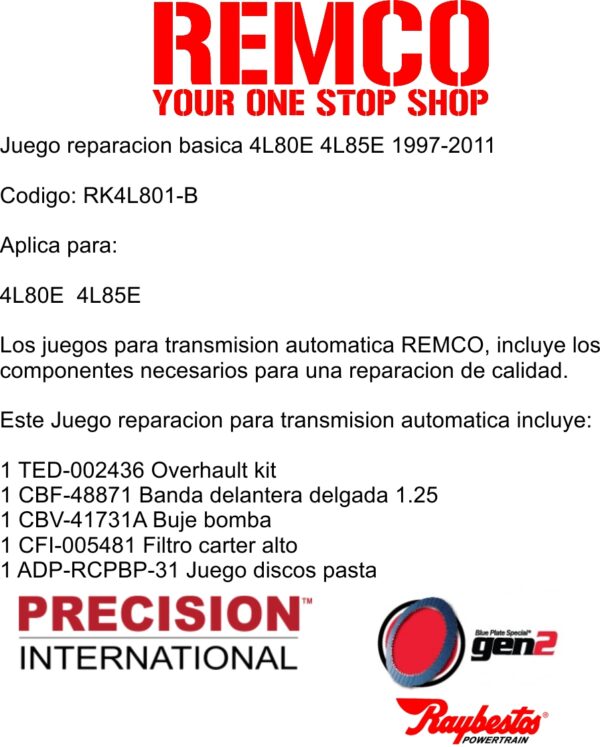 Los juegos para transmision automatica REMCO, incluye los componentes necesarios para una reparacion de calidad.