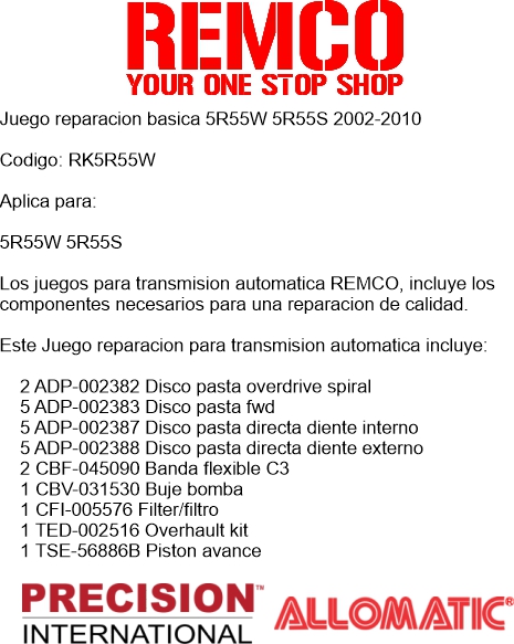 Los juegos para transmision automatica REMCO, incluye los componentes necesarios para una reparacion de calidad.