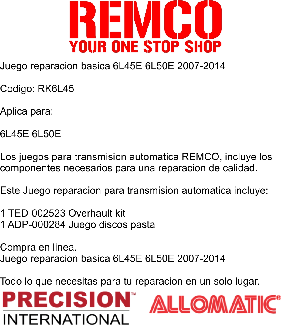 Los juegos para transmision automatica REMCO, incluye los componentes necesarios para una reparacion de calidad.