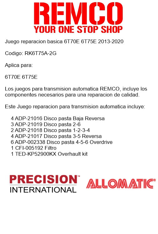 Los juegos para transmision automatica REMCO, incluye los componentes necesarios para una reparacion de calidad.