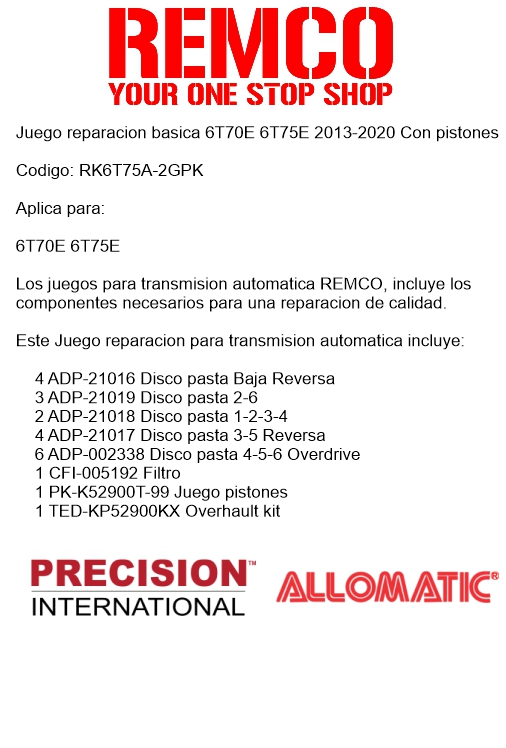 Los juegos para transmision automatica REMCO, incluye los componentes necesarios para una reparacion de calidad.