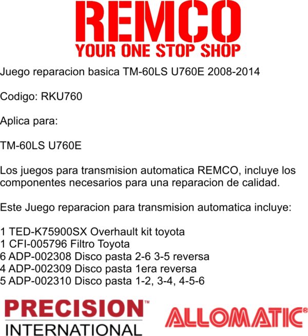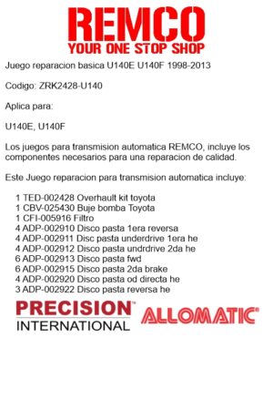 Los juegos para transmision automatica REMCO, incluye los componentes necesarios para una reparacion de calidad.