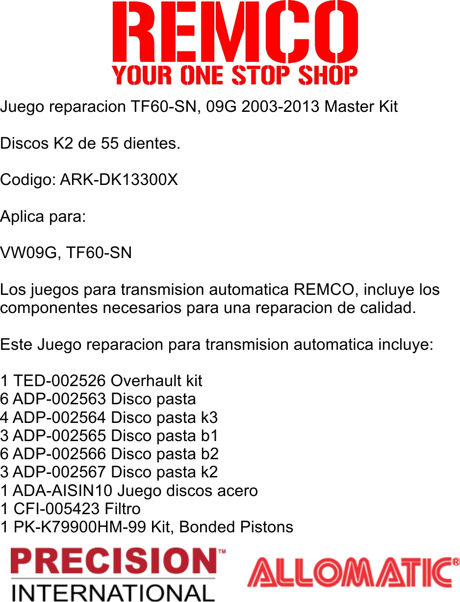 Los juegos para transmision automatica REMCO, incluye los componentes necesarios para una reparacion de calidad.