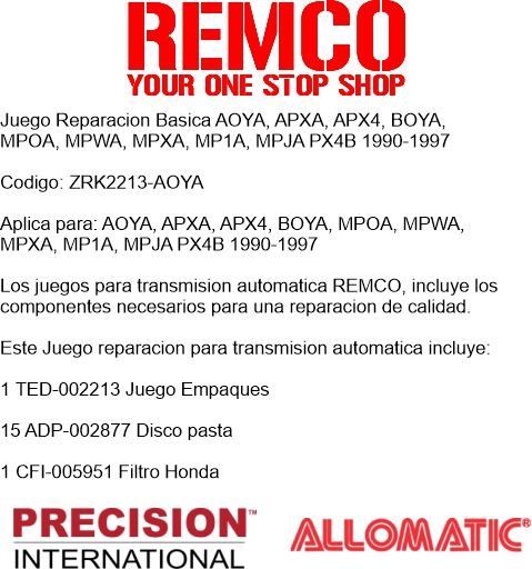 Los juegos para transmision automatica REMCO, incluye los componentes necesarios para una reparacion de calidad.