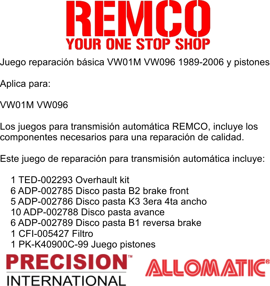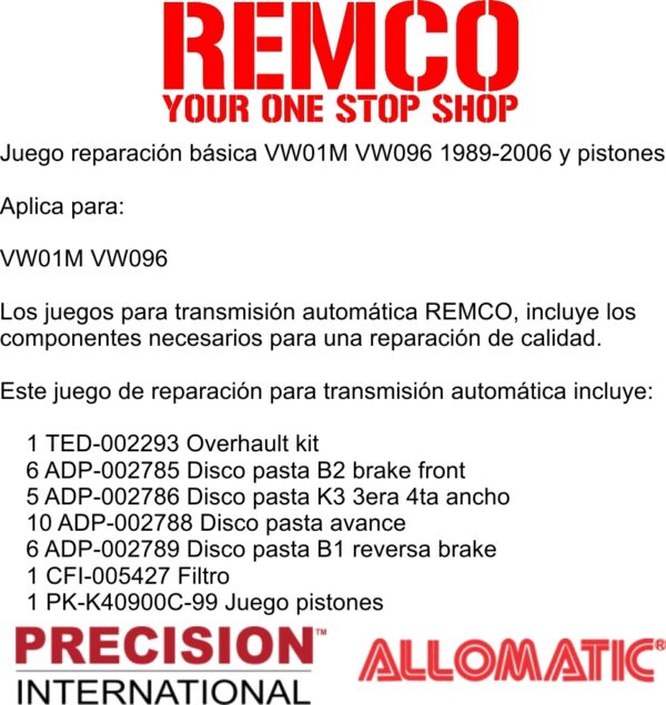 Los juegos para transmision automatica REMCO, incluye los componentes necesarios para una reparacion de calidad.