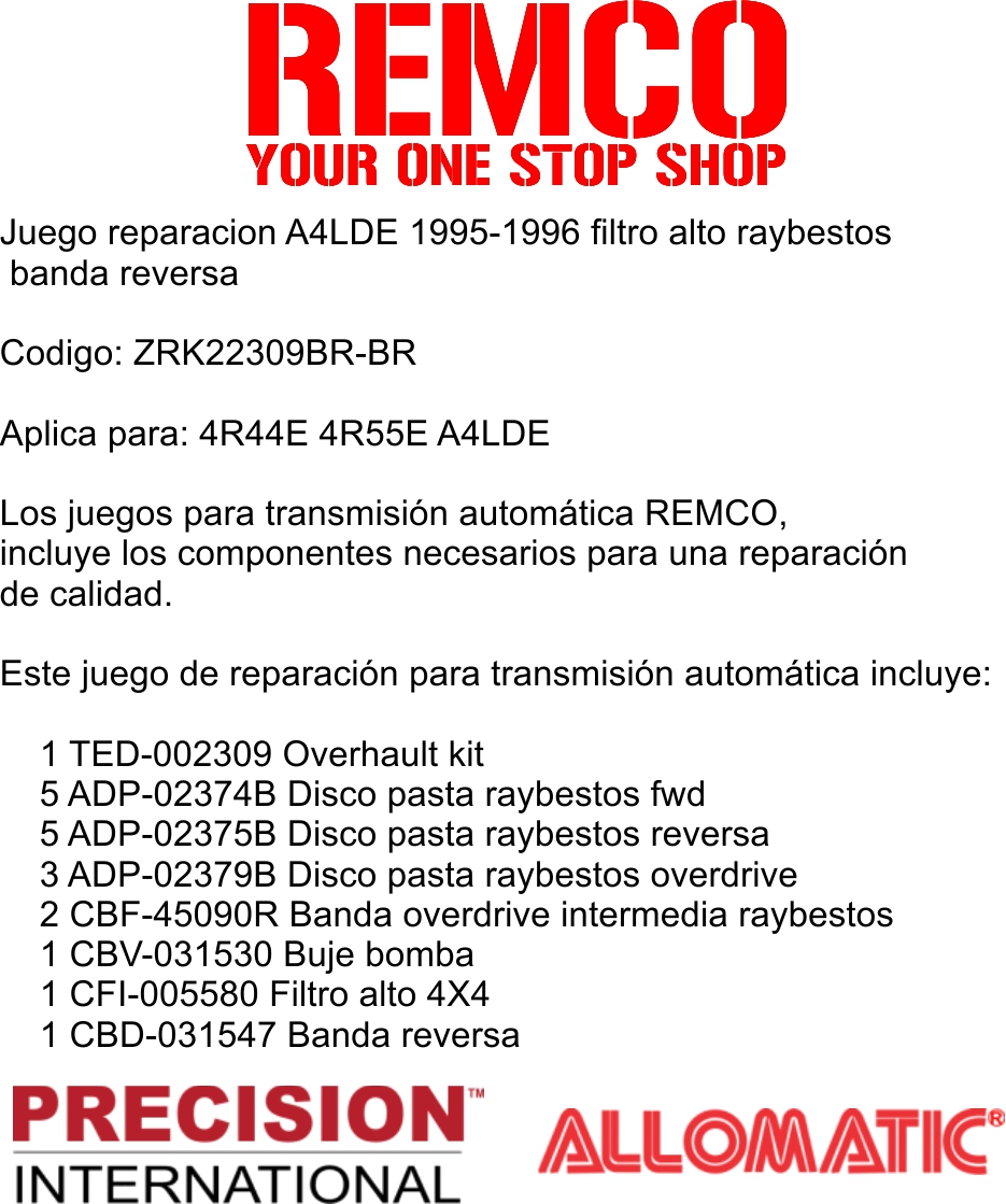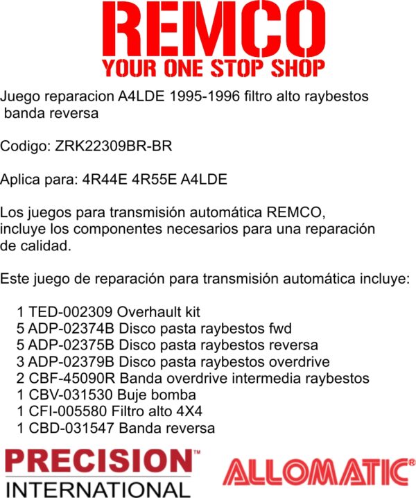 Los juegos para transmision automatica REMCO, incluye los componentes necesarios para una reparacion de calidad.
