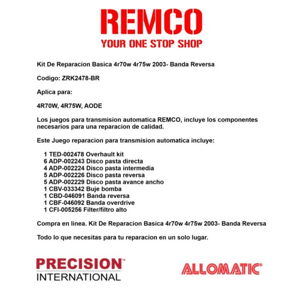 Los juegos para transmision automatica REMCO, incluye los componentes necesarios para una reparacion de calidad.